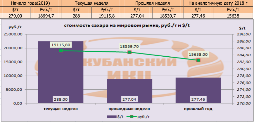 Цены на сахар-сырец (США No11) на момент подготовки материала зафиксированы на уровне 288,04 $/т, и соответственно 19115,8 руб/т при пересчёте.