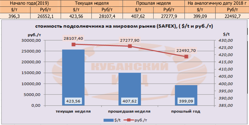 Цена подсолнечника на бирже SAFEX на момент написания была озвучена в значениях 423,56 $/т или 28107,4 руб/т.