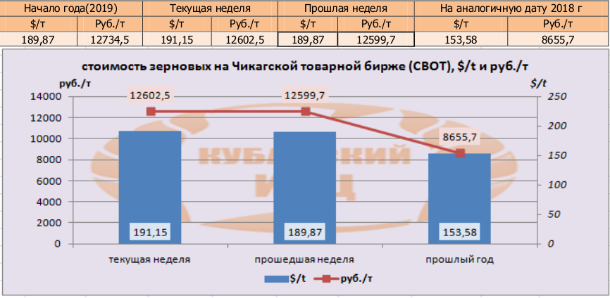 На момент написания статьи, на Чикагской товарной бирже (СВОТ) предлагают $ 191,15 за тонну пшеницы, или 12602,5 руб./т в перерасчёте на рубли, что больше в валюте, по сравнению с аналогичной датой прошлого года (153,58 $ и 8655,7 руб./т). По сравнению с прошлой неделей, цены повысились в рублёвом выражении и в валюте.