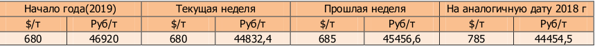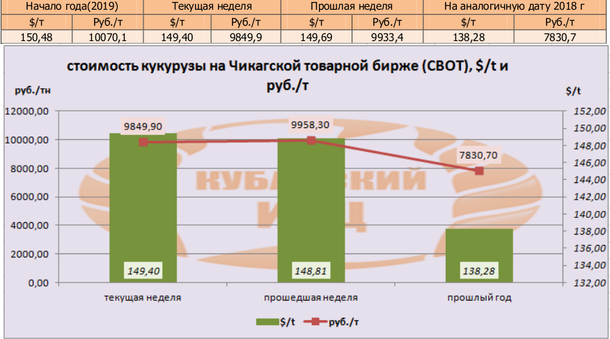 На момент написания статьи, цена кукурузы на мировых рынках (CBOT) была озвучена как 149,40 $/т или 9849,9 руб./т. По сравнению с данными прошлой недели, мы прослеживаем понижение цен в валюте, и в рублевом эквиваленте.