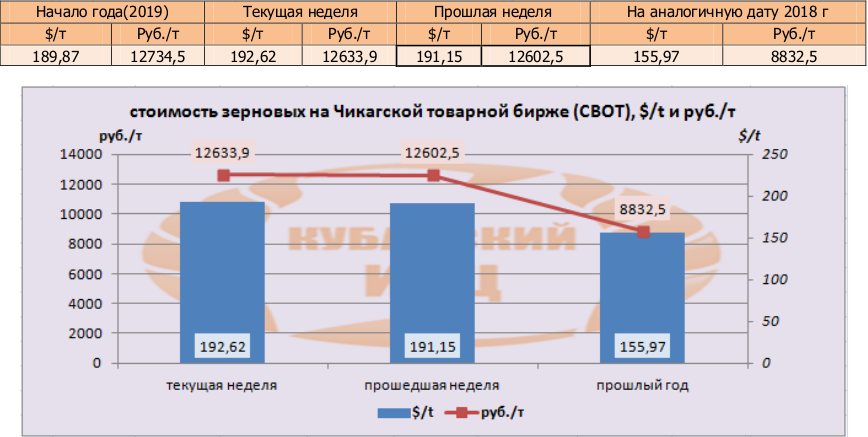 На момент написания статьи, на Чикагской товарной бирже (СВОТ) предлагают $ 192,62 за тонну пшеницы, или 12633,9 руб./т в перерасчёте на рубли, что больше в валюте, по сравнению с аналогичной датой прошлого года (155,97 $ и 8832,5 руб./т). По сравнению с прошлой неделей, цены повысились в рублёвом выражении и в валюте.