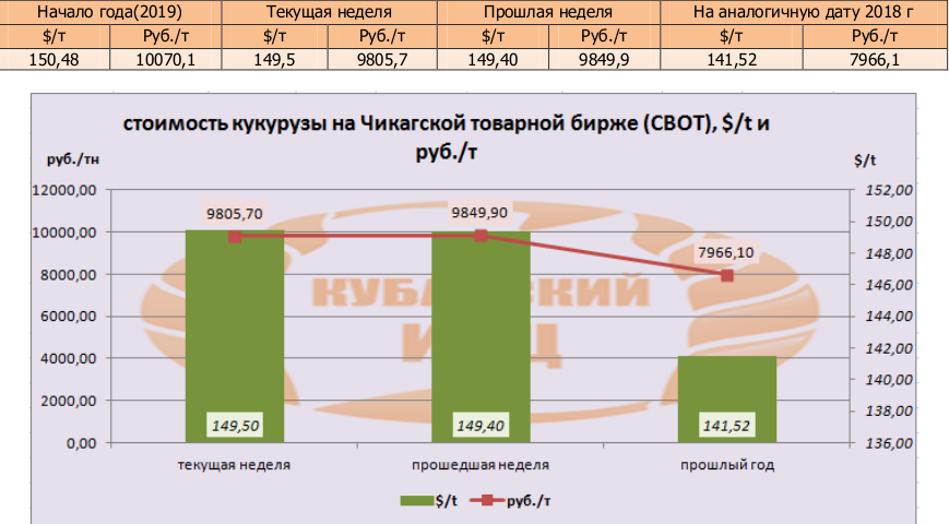 На момент написания статьи, цена кукурузы на мировых рынках (CBOT) была озвучена как 149,5 $/т или 9805,7 руб./т. По сравнению с данными прошлой недели, мы прослеживаем повышение цен в валюте, но не в рублевом эквиваленте.