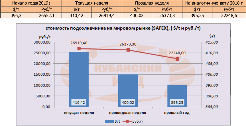 Цена подсолнечника на бирже SAFEX на момент написания была озвучена в значениях 410,42 $/т или 26919,4 руб/т.