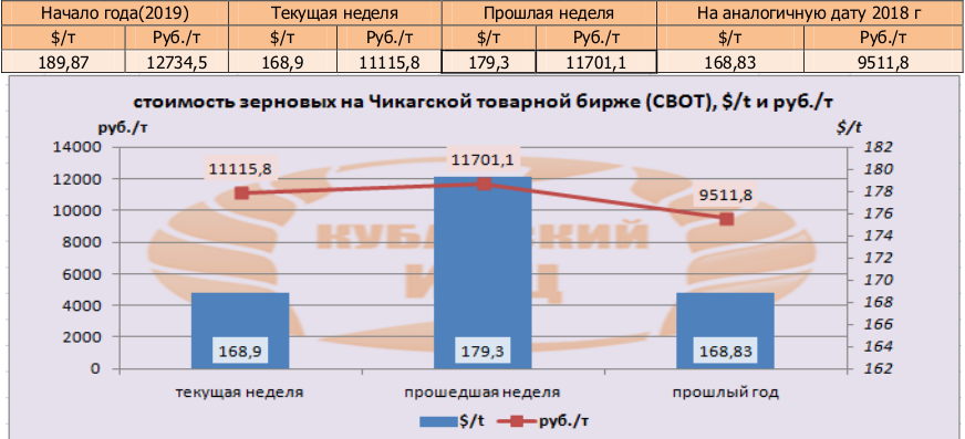 На момент написания статьи, на Чикагской товарной бирже (СВОТ) предлагают $ 168,9 за тонну пшеницы, или 11115,8 руб./т в перерасчёте на рубли, что больше в валюте, по сравнению с аналогичной датой прошлого года (168,83 $ и 9511,8 руб./т). По сравнению с прошлой неделей, цены понизились в рублёвом выражении и в валюте.