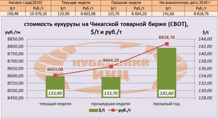 На момент написания статьи, цена кукурузы на мировых рынках (CBOT) была озвучена как 133,9 $/т или 8 603,08 руб./т. По сравнению с данными прошлой недели, мы прослеживаем повышение цен в валюте.
