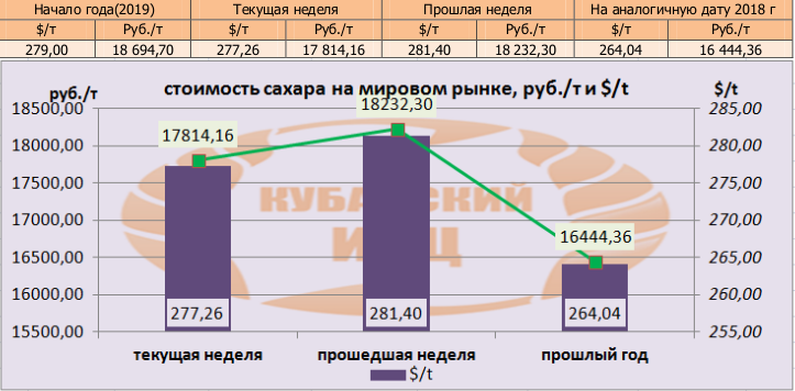 Цены на сахар-сырец (США No11) на момент подготовки материала зафиксированы на уровне 277,26 $/т, и соответственно 17814,16 руб./т при пересчёте.