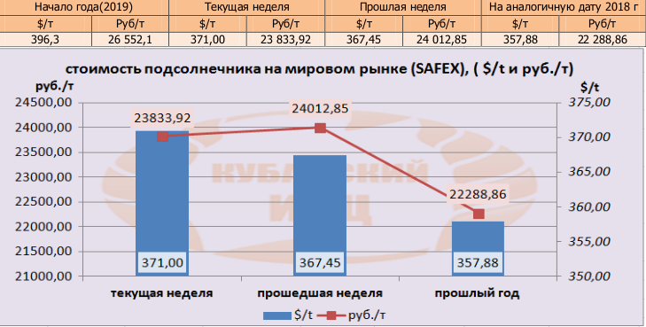 Цена подсолнечника на бирже SAFEX на момент написания прошлого обзора была озвучена в значениях 371,00 $/т или 23 833,92 руб/т.