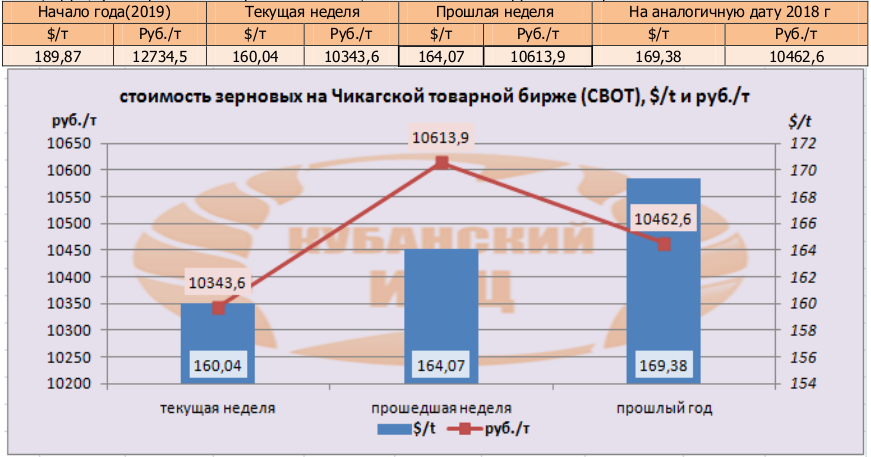 На момент написания статьи, на Чикагской товарной бирже (СВОТ) предлагают $ 160,04 за тонну пшеницы, или 10343,6 руб./т в перерасчёте на рубли, что ниже в валюте, по сравнению с аналогичной датой прошлого года (169,38 $ и 10462,6 руб./т). По сравнению с прошлой неделей, цены понизились в рублёвом выражении и в валюте.