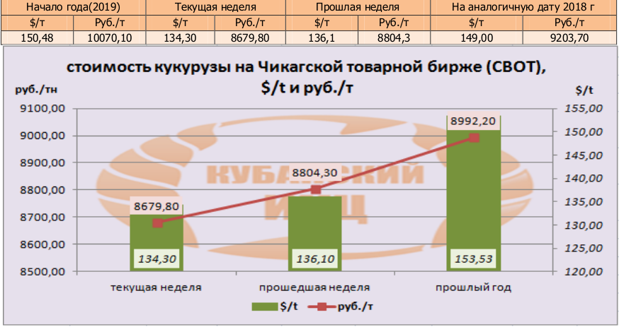 На момент написания статьи, цена кукурузы на мировых рынках (CBOT) была озвучена как 134,3 $/т или 8679,8 руб./т. По сравнению с данными прошлой недели, мы прослеживаем понижение цен в валюте.
