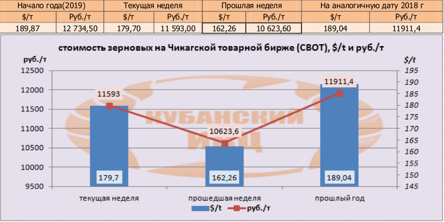 На момент написания статьи, на Чикагской товарной бирже (СВОТ) предлагают $179,70 за тонну пшеницы, или 11593,0 руб./т в перерасчёте на рубли, что ниже как в валюте, так и в рублевом эквиваленте по сравнению с аналогичной датой прошлого года ($188,04 и 11911,4 руб./т). По сравнению с прошлой неделей, цены понизились в рублёвом выражении.
