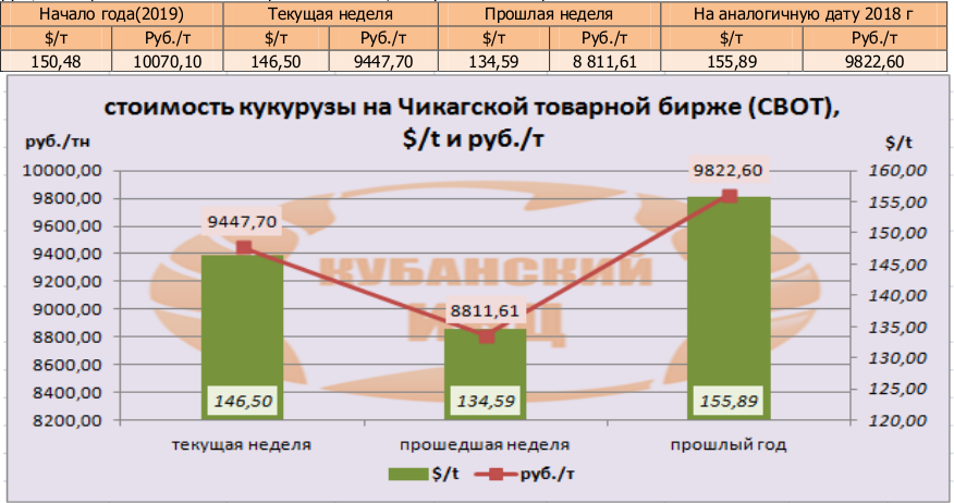 На момент написания статьи, цена кукурузы на мировых рынках (CBOT) была озвучена как 146,50 $/т или 9447,70 руб./т. По сравнению с данными прошлой недели, мы прослеживаем рост цен.