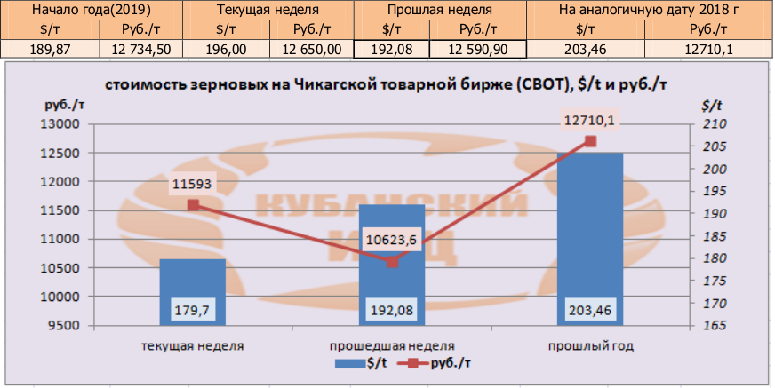 На момент написания статьи, на Чикагской товарной бирже (СВОТ) предлагают $196,00 за тонну пшеницы, или 12650,0 руб./т в перерасчёте на рубли, что меньше как в валюте, так и в рублевом эквиваленте по сравнению с аналогичной датой прошлого года ($203,46 и 12710,1 руб./т). По сравнению с прошлой неделей, цены незначительно повысились в рублёвом и валютном выражении.