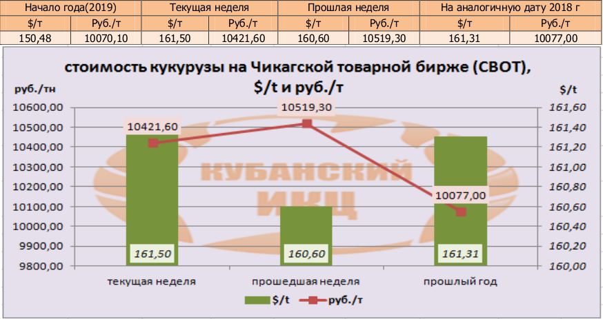 На момент написания статьи, цена кукурузы на мировых рынках (CBOT) была озвучена как 161,50 $/т или 10421,60 руб./т. По сравнению с данными прошлой недели, мы прослеживаем рост цен в валюте.