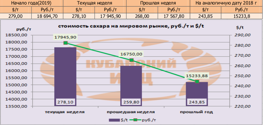 Цены на сахар-сырец (США No11) на момент подготовки материала зафиксированы на уровне 278,10 $/т, и соответственно 17945,9 руб./т при пересчёте.