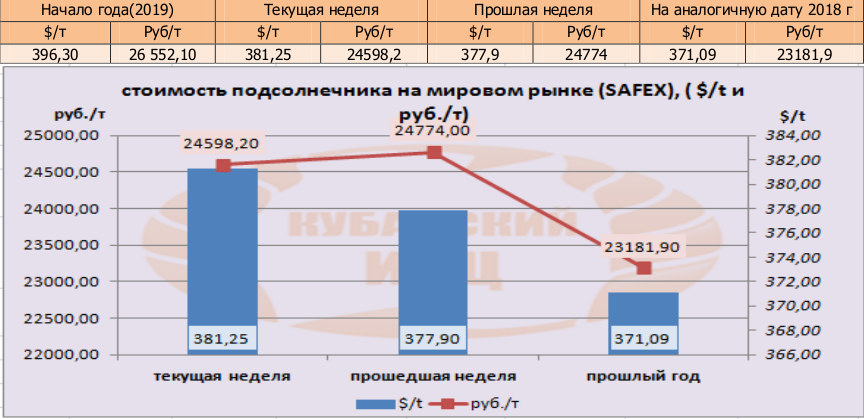 Цена подсолнечника на бирже SAFEX на момент написания прошлого обзора была озвучена в значениях 381,25 $/т или 24598,2 руб/т.