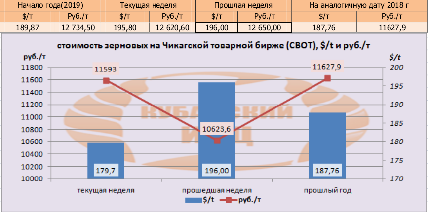 На момент написания статьи, на Чикагской товарной бирже (СВОТ) предлагают $195,00 за тонну пшеницы, или 12620,60 руб./т в перерасчёте на рубли, что больше как в валюте, так и в рублевом эквиваленте по сравнению с аналогичной датой прошлого года ($187,76 и 11627,9 руб./т). По сравнению с прошлой неделей, цены незначительно понизились в рублёвом и валютном выражении.