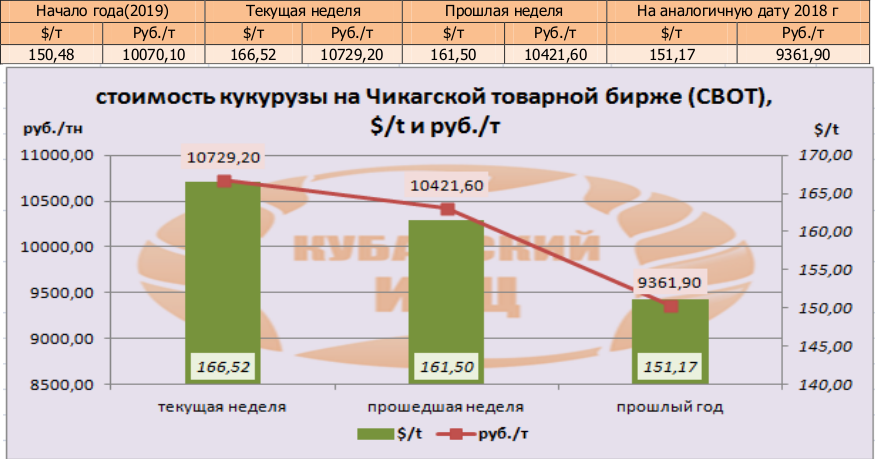 На момент написания статьи, цена кукурузы на мировых рынках (CBOT) была озвучена как 161,50 $/т или 10421,60 руб./т. По сравнению с данными прошлой недели, мы прослеживаем рост цен в валюте.