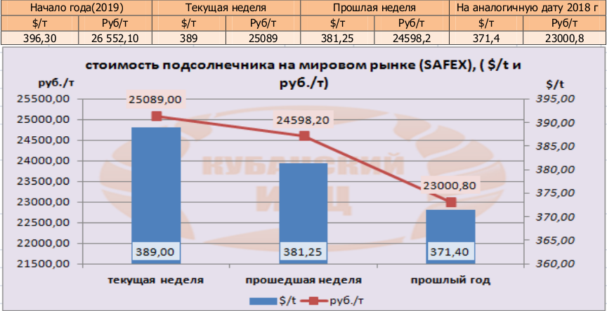 Цена подсолнечника на бирже SAFEX на момент написания прошлого обзора была озвучена в значениях 389,00 $/т или 25089,0 руб/т.