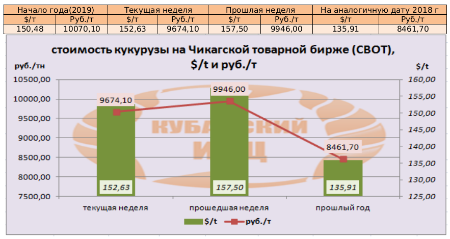 На момент написания статьи, цена кукурузы на мировых рынках (CBOT) была озвучена как 150,60 $/т или 9796,0 руб./т. По сравнению с данными прошлой недели, мы прослеживаем понижение цен в валюте, но не в рублях.