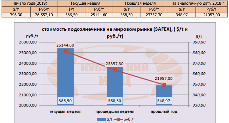 Цена подсолнечника на бирже SAFEX на момент написания прошлого обзора была озвучена в значениях 368,50 $/т или 25144,6 руб/т.
