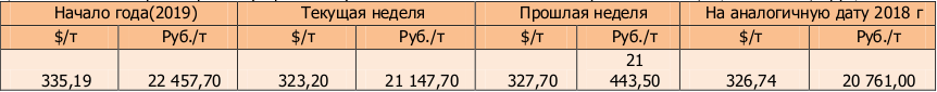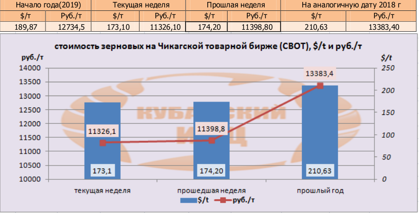 На момент написания статьи, на Чикагской товарной бирже (СВОТ) предлагают $173,1 за тонну пшеницы, или 11326,10 руб./т в перерасчёте на рубли, что меньше как в валюте, так и в рублевом эквиваленте по сравнению с аналогичной датой прошлого года ($210,63 и 13383,4 руб./т). По сравнению с прошлой неделей, цены понизились в валютном и рублёвом выражении.