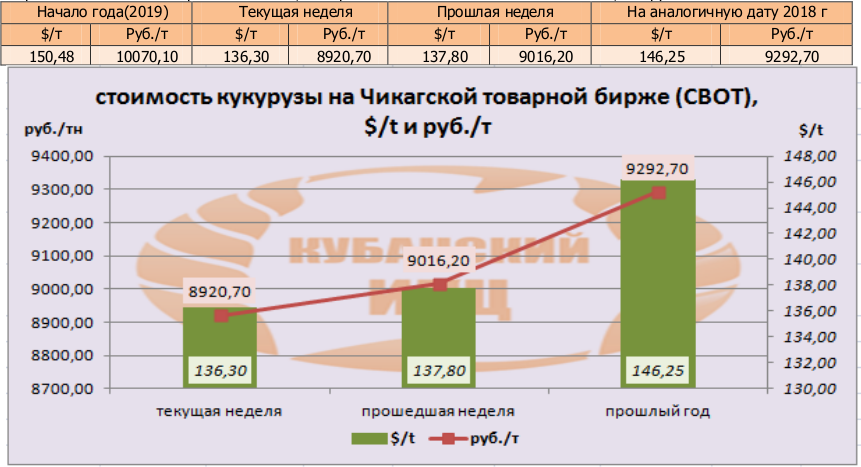 На момент написания статьи, цена кукурузы на мировых рынках (CBOT) была озвучена как 136,30 $/т или 8920,70 руб./т. По сравнению с данными прошлой недели, мы прослеживаем понижение цен в валюте, и в рублях.