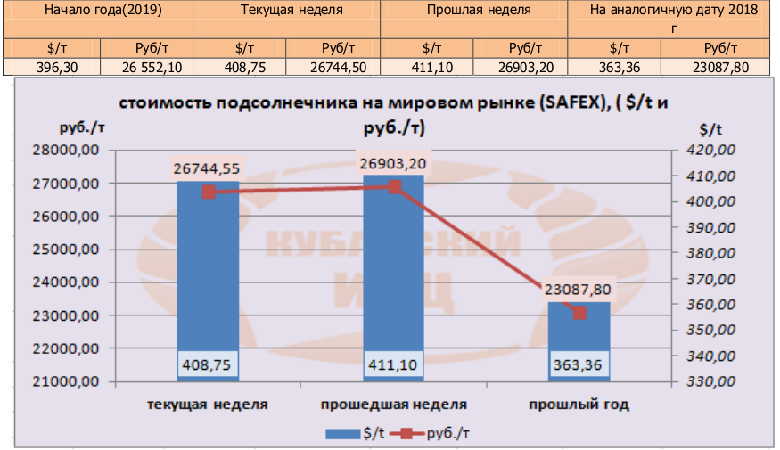 Цена подсолнечника на бирже SAFEX (поставка в декабре)на момент написания обзора была озвучена в значениях 408,75 $/т или 26744,5 руб/т.