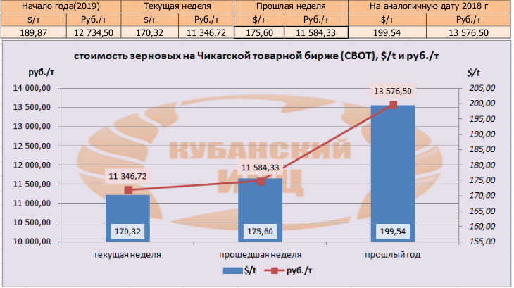 На момент написания статьи, на Чикагской товарной бирже (СВОТ) предлагают $170,32 за тонну пшеницы, или 11346,72 руб./т в перерасчёте на рубли, что меньше как в валюте, так и в рублевом эквиваленте по сравнению с аналогичной датой прошлого года ($199,54 и 13576,5 руб./т). По сравнению с прошлой неделей, цены снизились в валютном и рублёвом выражении.