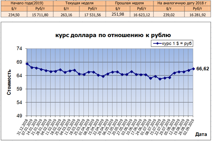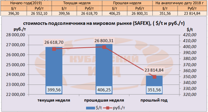 Цена подсолнечника на бирже SAFEX (поставка в сентябре) на момент написания обзора была озвучена в значениях 399,56 $/т или 26 618,70 руб/т.