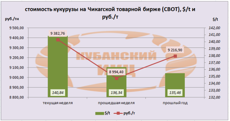 На момент написания статьи, цена кукурузы на мировых рынках (CBOT) была озвучена как 140,84 $/т или 9382,76 руб./т. По сравнению с данными прошлой недели, мы прослеживаем повышение цен в валюте, и в рублях.