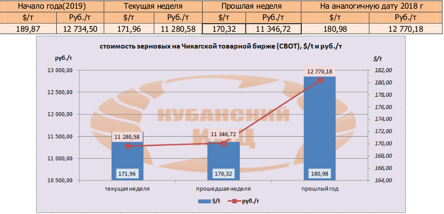 На момент написания статьи, на Чикагской товарной бирже (СВОТ) предлагают $171,96 за тонну пшеницы, или 11280,58 руб./т в перерасчёте на рубли, что выше в валюте, а в рублевом эквиваленте ниже по сравнению с прошлой неделей. По сравнению с аналогичной датой прошлого года цены на пшеницу ниже в обеих валютах.
