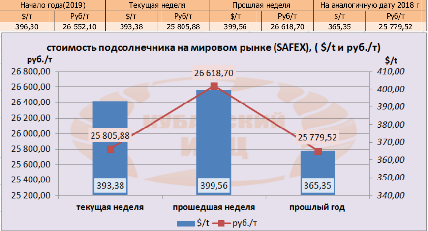 Цена подсолнечника на бирже SAFEX (поставка в сентябре) на момент написания обзора была озвучена в значениях 393,38$/т или 25805,88 руб/т.