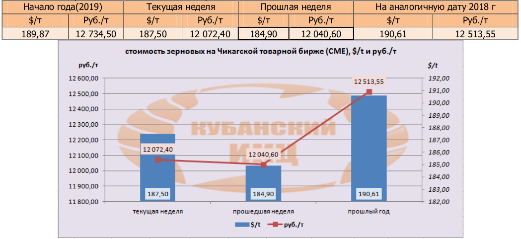 На момент написания статьи, на Чикагской товарной бирже (СВОТ) предлагают $187,5 за тонну пшеницы, или 120072,40 руб./т в перерасчёте на рубли, что больше в валюте и в рублевом эквиваленте по сравнению с прошлой неделей. По сравнению с аналогичной датой прошлого года цены на пшеницу ниже в обеих валютах.