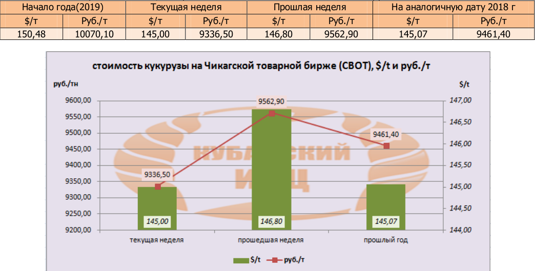 На момент написания статьи, цена кукурузы на мировых рынках (CBOT) была озвучена как 145,0 $/т или 9336,5 руб./т. По сравнению с данными прошлой недели, мы прослеживаем понижение цен в валюте и в рублях.