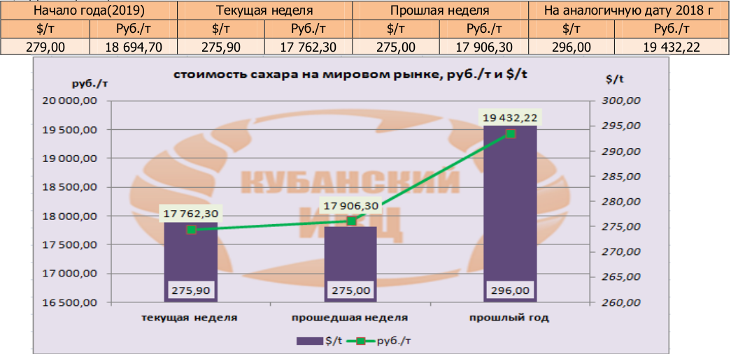Цены на сахар-сырец (США No11) на момент подготовки материала зафиксированы на уровне 275,9 $/т, и соответственно 17762,3 руб./т при пересчёте.