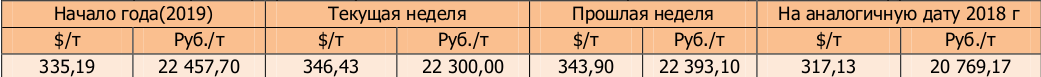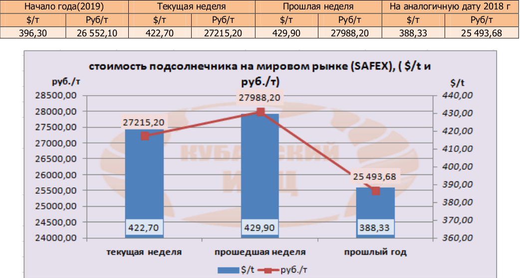Цена подсолнечника на бирже SAFEX (поставка в сентябре) на момент написания обзора была озвучена в значениях 422,70 $/т или 27215,2 руб/т.