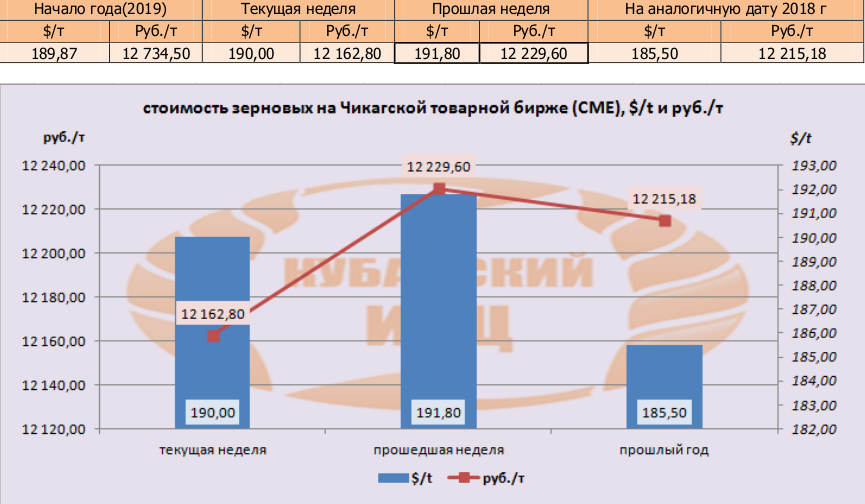 На момент написания статьи, на Чикагской товарной бирже (СВОТ) предлагают $190,0 за тонну пшеницы, или 12162,80 руб./т в перерасчёте на рубли, что меньше в валюте и в рублевом эквиваленте по сравнению с прошлой неделей. По сравнению с аналогичной датой прошлого года цены на пшеницу выше в валюте.