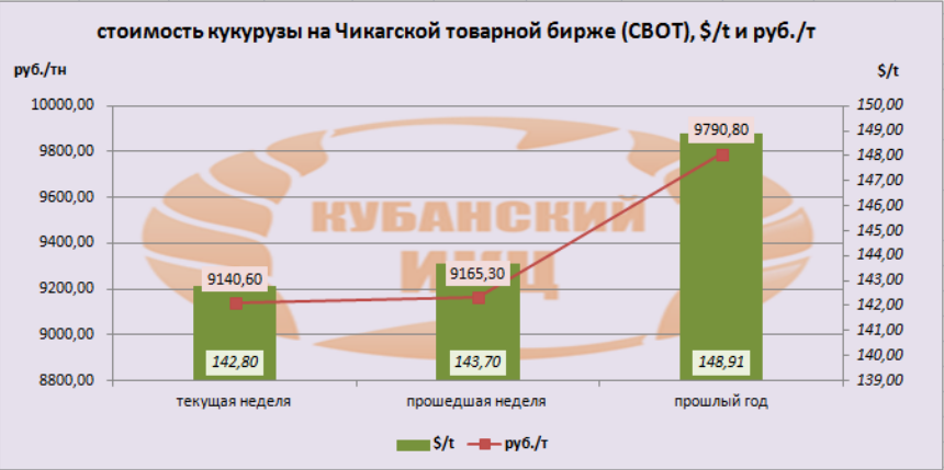 На момент написания статьи, цена кукурузы на мировых рынках (CBOT) была озвучена как 142,80 $/т или 9140,60 руб./т. По сравнению с данными прошлой недели, мы прослеживаем понижение цен в валюте и в рублях.