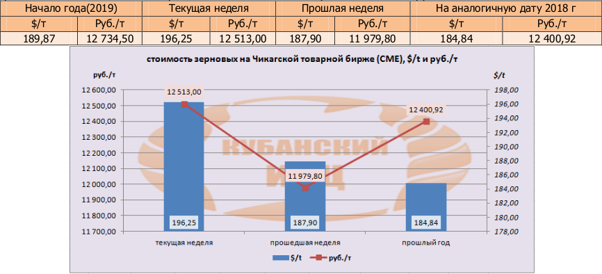 На момент написания статьи, на Чикагской товарной бирже (СВОТ) предлагают $196,25 за тонну пшеницы, или 12513,00 руб./т в перерасчёте на рубли, что больше в валюте и в рублевом эквиваленте по сравнению с прошлой неделей. По сравнению с аналогичной датой прошлого года цены на пшеницу выше в валюте и рублях.