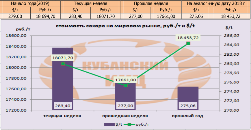 Цены на сахар-сырец (США No11) на момент подготовки материала зафиксированы на уровне 283,40 $/т, и соответственно 18071,70 руб./т при пересчёте.