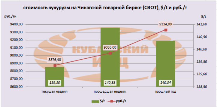 На момент написания статьи, цена кукурузы на мировых рынках (CBOT) была озвучена как 139,30 $/т или 8876,40 руб./т. По сравнению с данными прошлой недели, мы прослеживаем понижение цен в валюте и в рублях.
