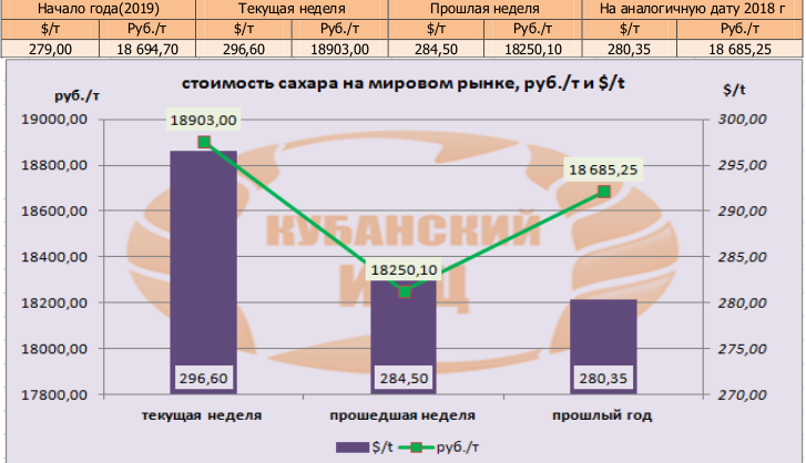 Цены на сахар-сырец (США No11) на момент подготовки материала зафиксированы на уровне 296,60 $/т, и соответственно 18903,00 руб./т при пересчёте.