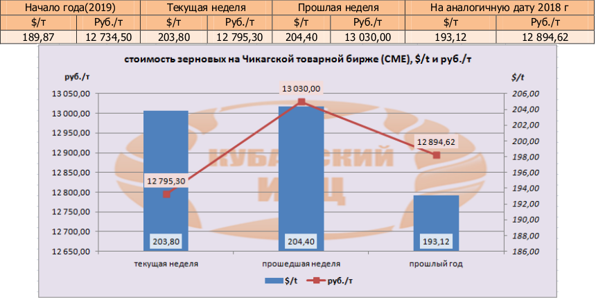 На момент написания статьи, на Чикагской товарной бирже (СВОТ) предлагают $203,80 за тонну пшеницы, или 12795,30 руб./т в перерасчёте на рубли, что меньше в валюте и в рублевом эквиваленте по сравнению с прошлой неделей. По сравнению с аналогичной датой прошлого года цены на пшеницу выше в валюте, но не в рублях.