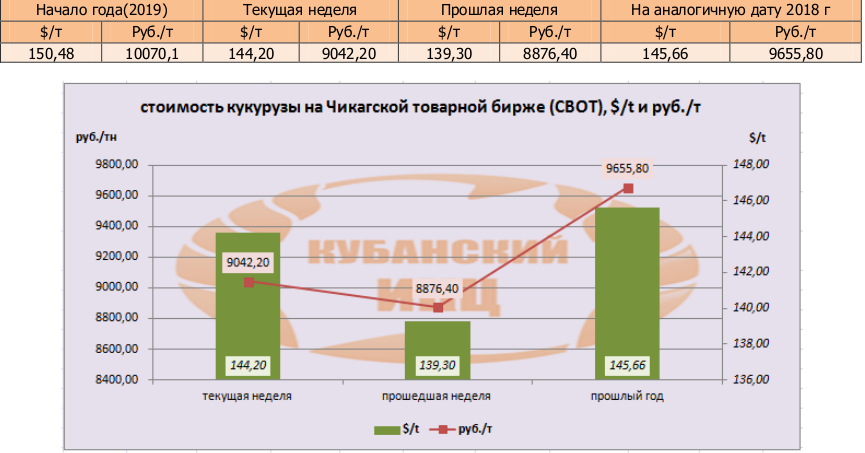 На момент написания статьи, цена кукурузы на мировых рынках (CBOT) была озвучена как 139,30 $/т или 8876,40 руб./т. По сравнению с данными прошлой недели, мы прослеживаем понижение цен в валюте и в рублях.