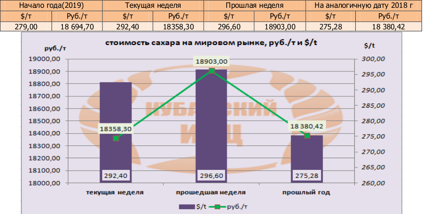 Цены на сахар-сырец (США No11) на момент подготовки материала зафиксированы на уровне 292,40 $/т, и соответственно 18358,30 руб./т при пересчёте.