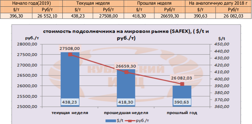 Цена подсолнечника на бирже SAFEX (поставка в декабре) на момент написания обзора была озвучена в значениях 418,3 $/т или 26659,3 руб/т.