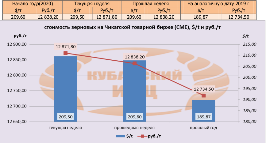 На момент написания статьи, на Чикагской товарной бирже (СВОТ) предлагают $209,5 за тонну пшеницы, или 12871,80 руб./т в перерасчёте на рубли, что меньше в валюте, но не в рублевом эквиваленте по сравнению с прошлой неделей. По сравнению с аналогичной датой прошлого года цены на пшеницу выше в валюте, и в рублях.