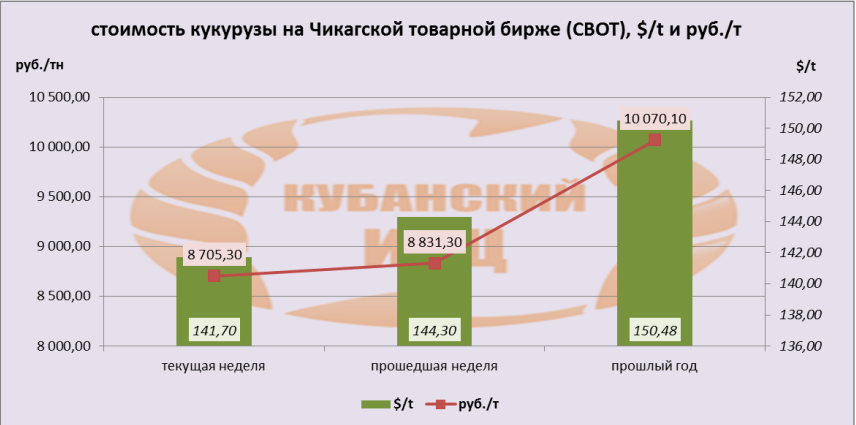 На момент написания статьи, цена кукурузы на мировых рынках (CBOT) была озвучена как 141,70 $/т или 8705,30 руб./т. По сравнению с данными прошлой недели, мы прослеживаем понижение цен в валюте и в рублях.