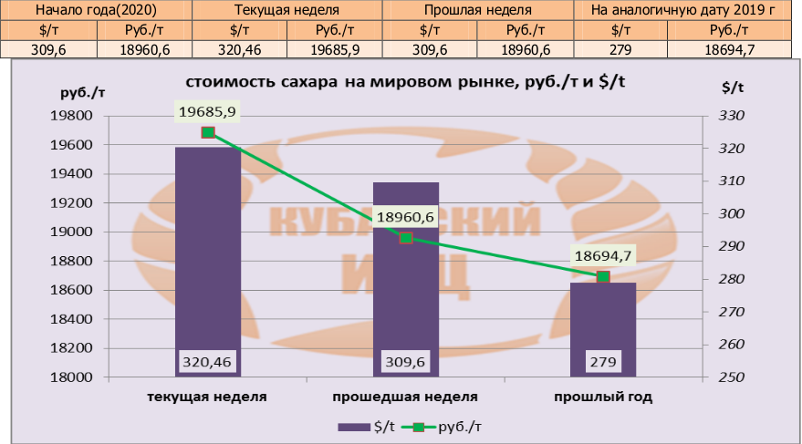 Цены на сахар-сырец (США No11) на момент подготовки материала зафиксированы на уровне 320,46 $/т, и соответственно 19685,9 руб./т при пересчёте.
