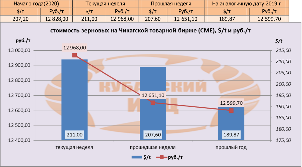 На момент написания статьи, на Чикагской товарной бирже (СВОТ) предлагают $211,00 за тонну пшеницы, или 12968,00 руб./т в перерасчёте на рубли, что больше в валюте, и в рублевом эквиваленте по сравнению с прошлой неделей. По сравнению с аналогичной датой прошлого года цены на пшеницу выше в валюте, и в рублях.